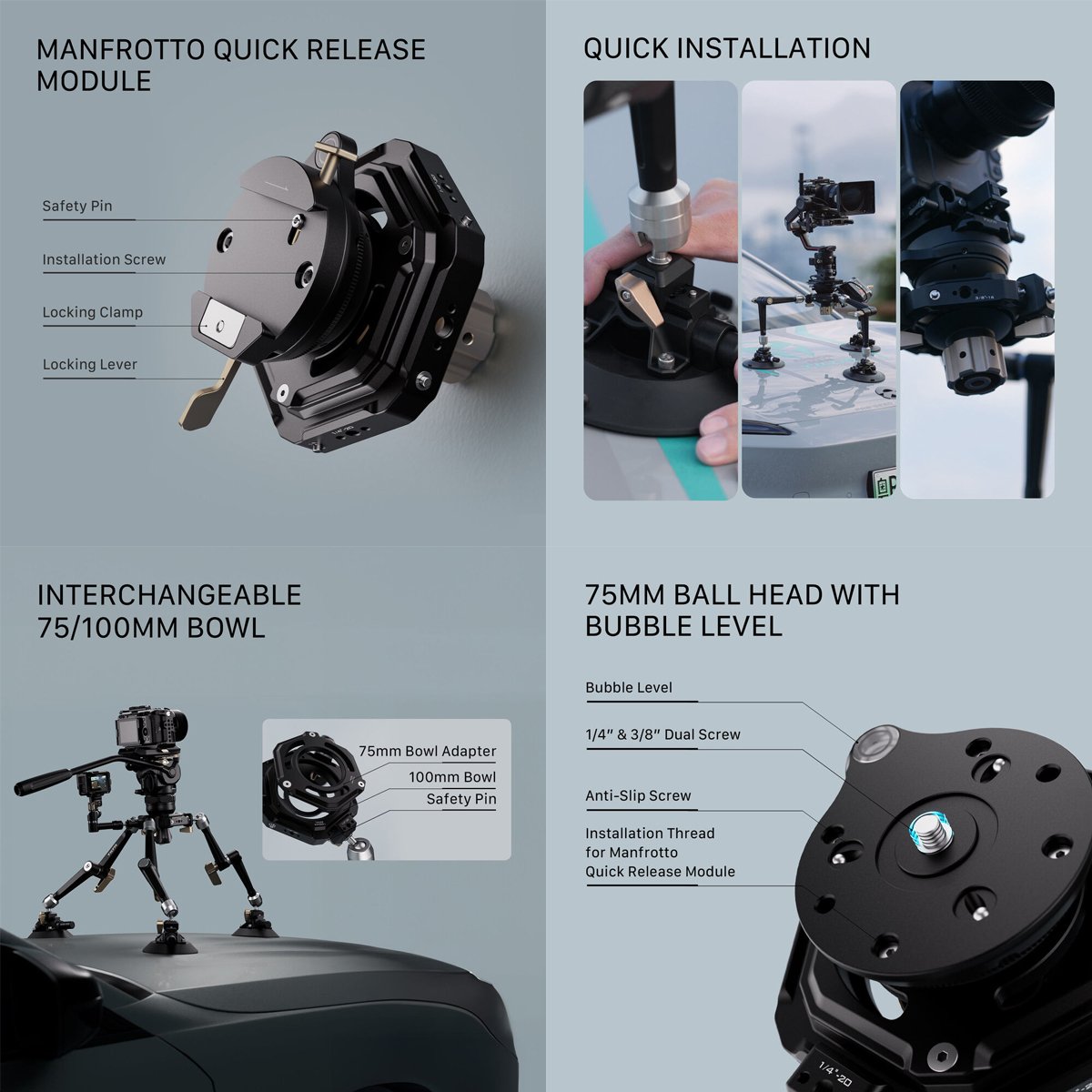 A Manfrotto quick release system allows you to secure your compatible Arca-type or Manfrotto camera cages and rigs to the car mount. The system also includes a 75/100mm bowl adapter to accommodate different ball heads. Once assembled, the system has a load capacity of 44 lb to support most rig configurations. Store all of the components in the included carrying case for easy transport.